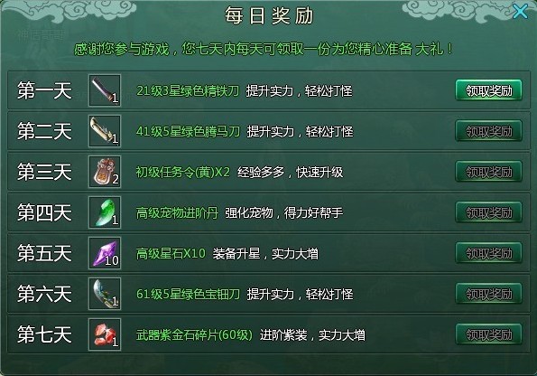 每天上线即可领取一份精美礼包,连续7天,在“便捷面板”中选择“礼包领取”