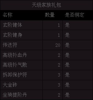 3、家族排行榜第一位即每位家族成员得到“天级家族礼包”*1;