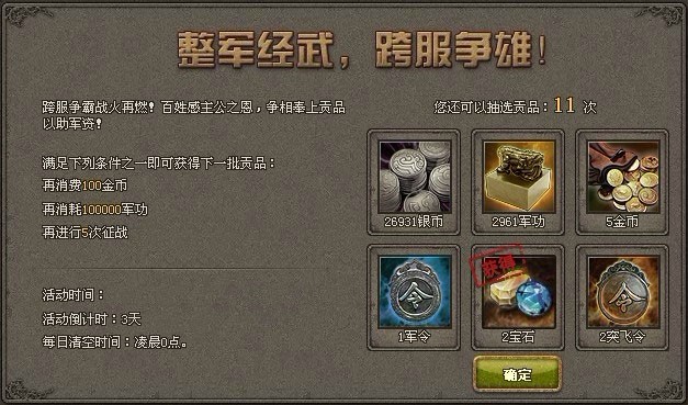 每获得一批贡品,您都能在六件中抽选其一,不仅有可能得到银币、金币、军令、军功、威望、突飞令中的一种,还有机会获得额外2倍、4倍、10倍暴击奖励。