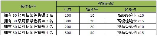活动内容:活动时间内招募紫色武将满足以下条件即可获得相应的礼包奖励!