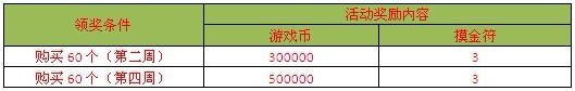 活动时间:开服第二周和第四周(注意:第二周与第四周奖励额度不同)