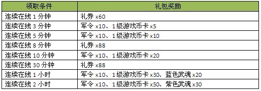 活动内容:活动期间,玩家单次连续在线满相应条件即可领取相应的礼包奖励