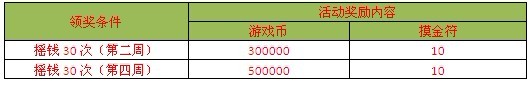 活动内容:活动时间内,每日摇钱满30次即可领取丰富奖励一份。(每天领奖一次)