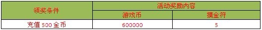 活动内容:活动时间内,每日充值满500金币即可领取丰富奖励一份。(每天领奖一次)