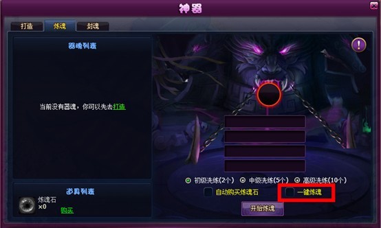 4.         vip10以上新增一键炼魂功能,点击一键炼魂后会将器魂所有属性提升到最接近的颜色,依次为白,绿,蓝,紫,橙
