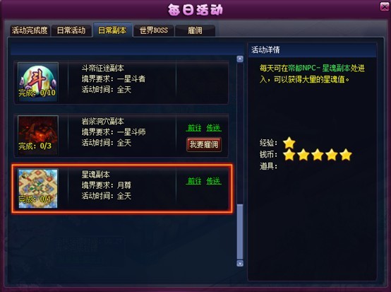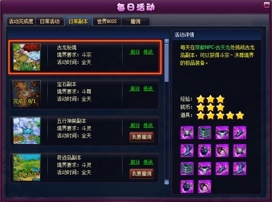 5.         活动面板日常副本新增古龙秘境,星魂副本。