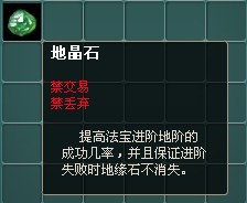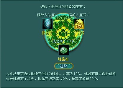 1.法宝分为凡阶法宝、人阶法宝和地阶法宝三种,其中凡阶法宝分为白,绿,蓝三色,人阶法宝和地阶法宝为紫色。2.人阶法宝可以通过进阶升级为地阶法宝,进阶后,法宝将拥有更高的基础属性,精炼上限和技能等级上限。3.法宝进阶需要道具“地缘石”,此道具较为稀有,可以在高级精英副本中随机得到,4.在进阶法宝时可以使用“地晶石”来保护地缘石在进阶失败时不消失,并可以提高一定的成功几率。5.法宝进阶可以在“洞府”的“炼宝阁”找到,见下图: