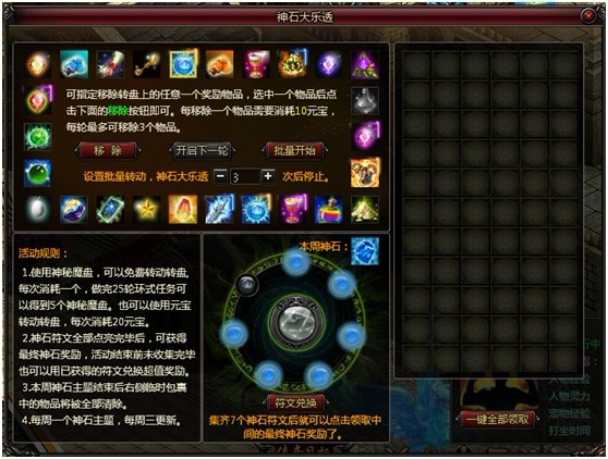 每周三进行神石更新,每轮活动结束前,玩家未收集完毕7枚神石符文可以用已获得的神石符文兑换超值奖励,当期活动结束前一轮神石符文不保存。